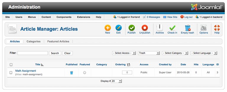 Joomla 1.6 ahora es compatible con la gestión de la basura integrado para todo el contenido. Vea el vídeo sobre Joomla 1.6 manejo de la basura para obtener más información.